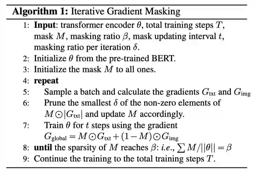 直观地说,掩码M应该为文本预训练选择最重要的梯度,并将其余梯度留给图像预训练,因此基于的大小启发式地生成掩码M。受网络修剪文献中使用的迭代幅度修剪算法的启发,作者设计了一个迭代梯度掩蔽程序,以逐渐增加掩蔽的稀疏性,算法如下图所示。
