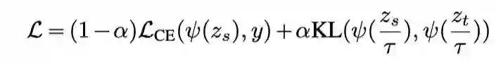 其中 ψ 表示softmax函数,α 是平衡ground-truth label的交叉熵损失 () 和KL散度的比率,τ 是蒸馏中使用的温度超参数。