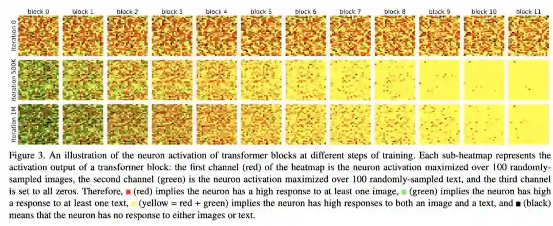上图展示了在训练的不同步骤中,Transformer块的神经元激活值图示。