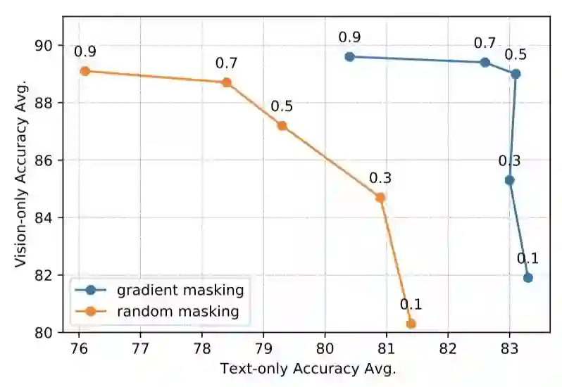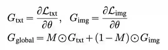 受神经网络剪枝结果的启发,作者提出了一种新的梯度掩蔽策略,以协调来自文本预训练和图像预训练的潜在冲突梯度。主要思想是,保留文本预训练的最重要梯度的子集,而忽略其他梯度,为图像预训练留出空间。设 θ 为共享Transformer编码器中的参数,分别为文本预训练任务和图像预训练任务的损失。作者通过一种自适应的掩码M将文本和图像预训练任务中的梯度结合起来: