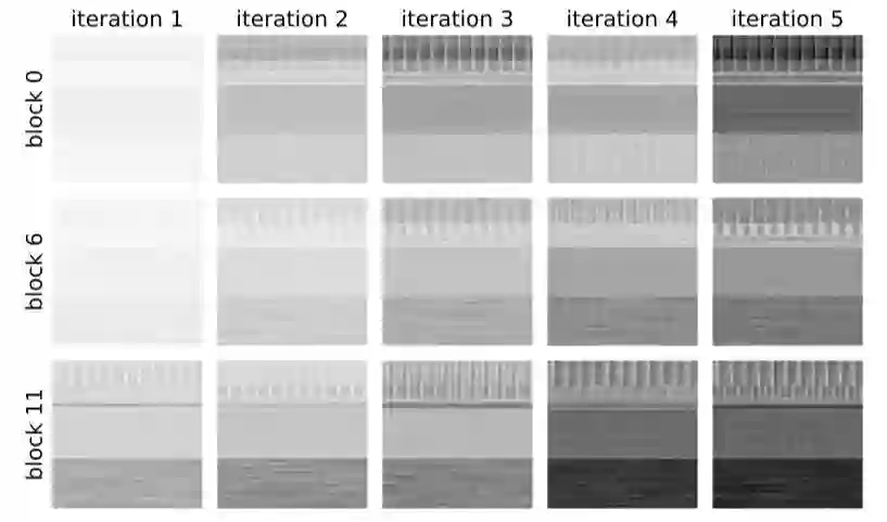 上图展示了在不同的mask更新迭代中,Transformer编码器块0、6和11的梯度mask的可视化。