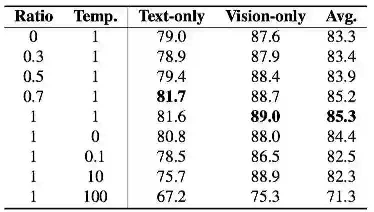 上表展示了本文方法在不同Text-only和Vision-only任务上的实验结果。