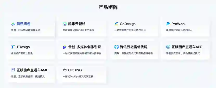 腾讯设计云矩阵共包含十款产品,如主打智能设计的云创、腾讯云智绘,主打设计协同的ProWork和CoDeign、主打快速研发的微搭低代码和CODING等。