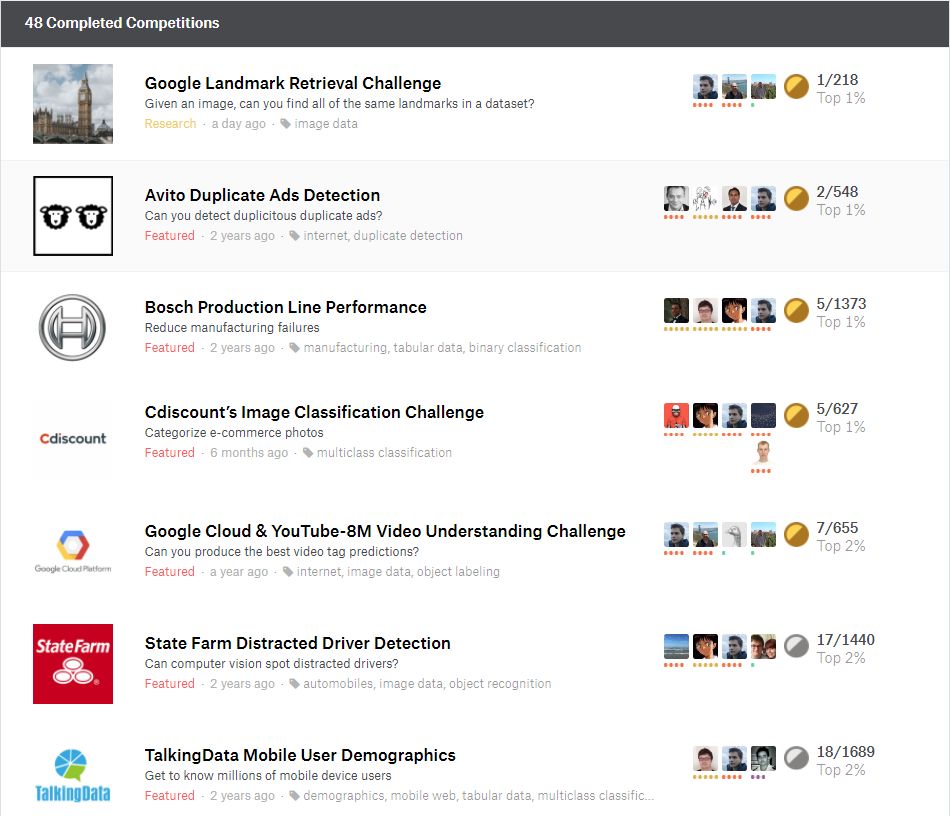 anokas 两年前就已经开始参加 Kaggle 竞赛,在完成的 48 项竞赛中,他一共获得了 5 块金牌、7 块银牌和 5 块铜牌。除了这一项地标图像检索,他还获得了谷歌云与 YouTube-8M 视频理解挑战赛的第七名。以下是他排名比较靠前的竞赛: