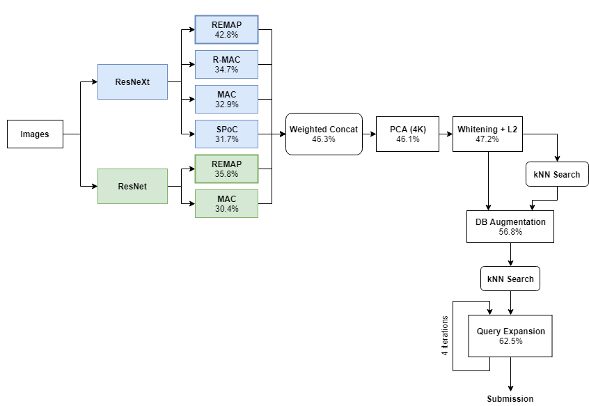 基于区域熵的多层抽象池化(REMAP)[42.8% mAP]:这是我们全新设计的全局描述子,它聚合了来自不同卷积层的层级化深度特征,并训练表征多个互补的层级视觉抽象。我们计划在即将来到的 CVPR Workshop 中展示 REMAP 架构的细节。