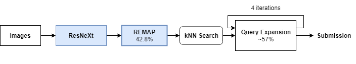 在这场竞赛中,我们设计了一种新的快速技术用于查询扩展,它可以通过多个中间步骤递归地运行来捕捉图像之间的长程连接(long-distance connection)。这使得该技术非常适用于这类问题,因为很多地标有很多图像,只有一张图像需要与查询相匹配,同一地标的其它图像被附加到 top-100 列表中。