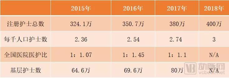 焦雅辉透露,2018年底,全国注册护士总数超过400万,每千人口护士数达到3人;2017年底,我国注册护士总数超过380万人,每千人口护士数2.74。