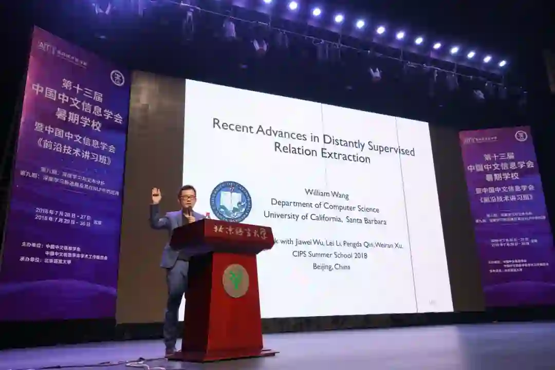 王威廉博士作题为《Recent Advances in Knowledge Graph Construction and Reasoning》的报告。该报告针对目前基于各种学习算法产生的大规模的质量不高的知识图谱的现状,讲述如何做进一步的优化。报告的内容包括基于距离监督的关系抽取、知识图谱表示和知识图谱的推理三个主要方向。从三个不同的角度对于已有知识图谱进行优化和补全工作。并且从其自身对该领的理解,展望知识图谱的未来研究方向。
