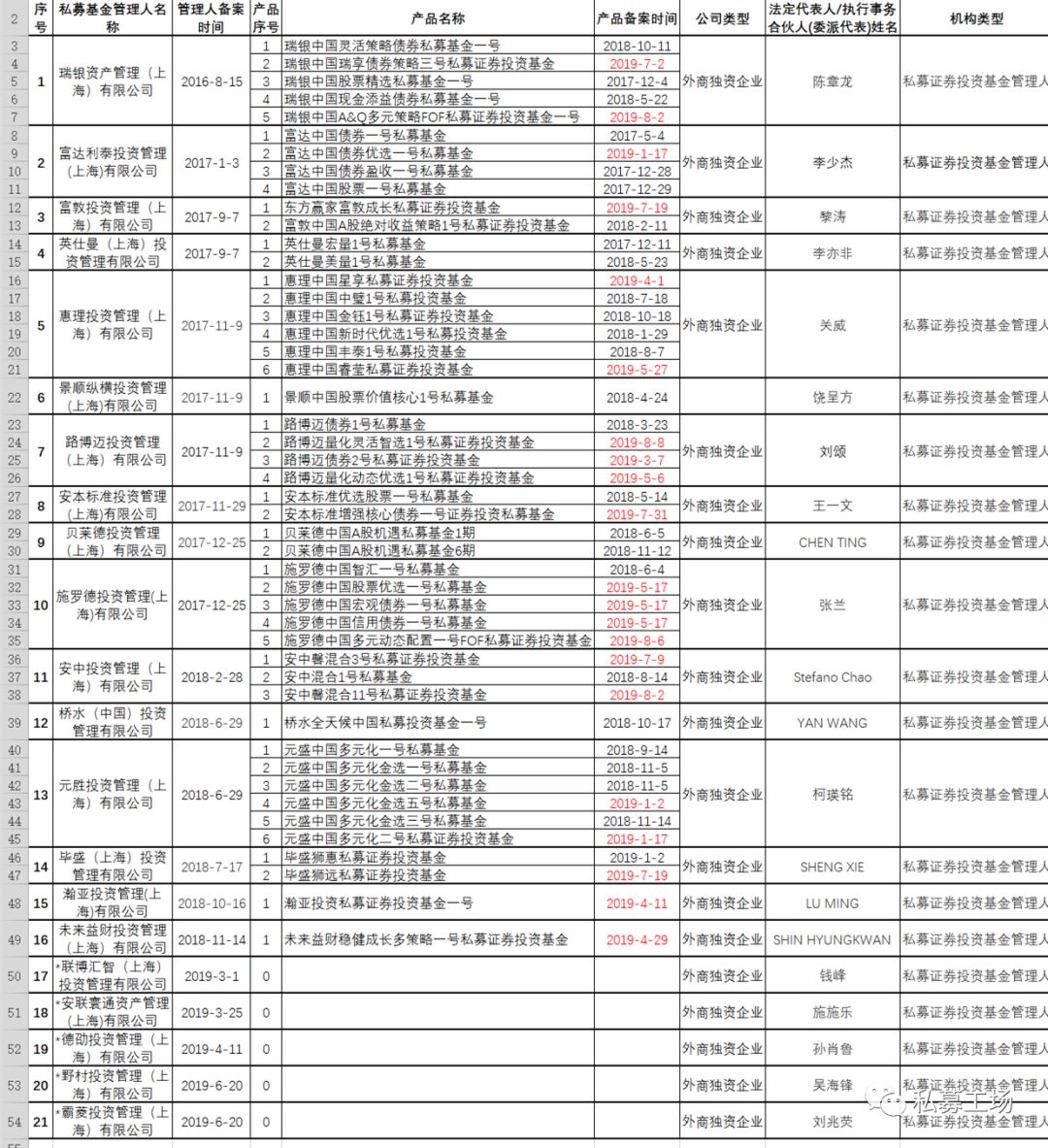协会数据显示,截至目前,共有21家外资机构在协会登记,备案产品47只,资产管理规模超过54亿元人民币。目前,备案产品较多的外资私募包括惠理投资、元胜投资,均推出了6只中国私募基金,瑞银资管、施罗德投资也备案了5只基金。