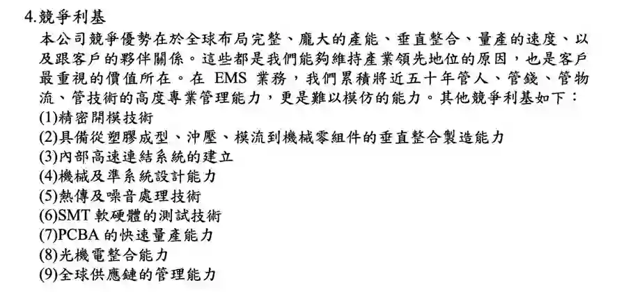 以富士康在财报中提到的“精密开模技术”“垂直整合能力”为例,模具制造能力是制造业企业保证产量和质量的核心技术。
