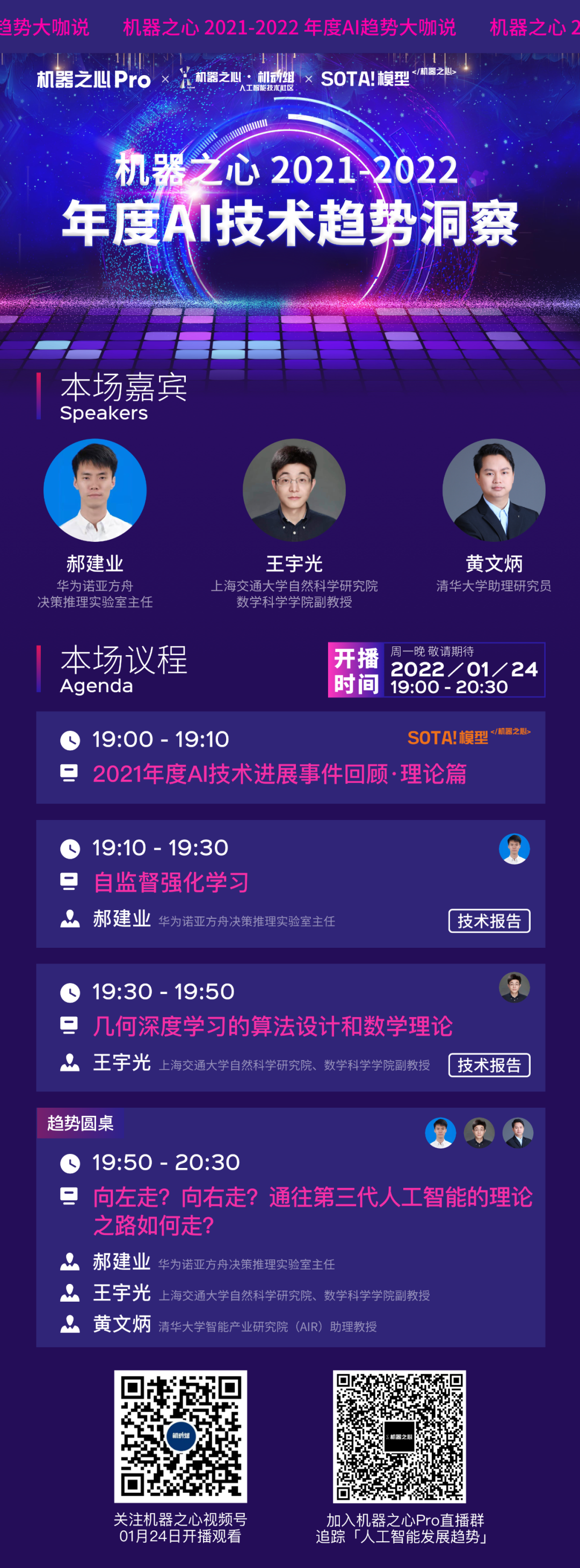 2022 年 1 月 24 日晚 7 点,在机器之心年度特别策划「驱动未来的 AI 技术 —— 2021-2022 年度 AI 技术趋势洞察」的「理论专场」来自华为诺亚方舟决策推理实验室主任郝建业教授、数学科学学院王宇光教授及清华大学智能产业研究院黄文炳教授三位嘉宾将做客机器之心「2020-2021 年度 AI 技术趋势洞察」直播间,分别通过技术报告介绍自监督深度学习、几何深度学习的最新进展与思考、并共同就「通往第三代人工智能的理论之路如何走?」等话题进行探讨。