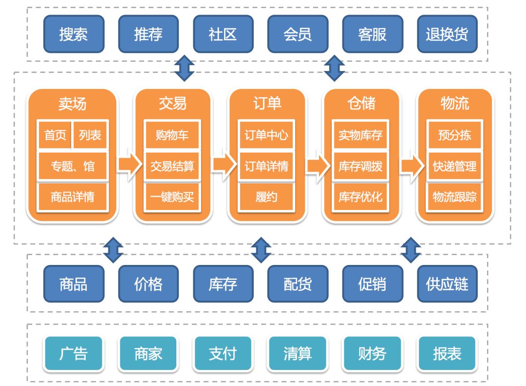 以电商行业为例,电商系统在应用系统层面大致可划分为卖场、交易、订单、仓储、物流等主流程系统,搜索、推荐、社区、会员、客服、退换货等面向用户的前端系统,商品、价格、库存、配货、促销、供应链等面向后台员工的后端系统,以及广告、商家、支付、清算、财务、报表等面向合作伙伴的辅助系统,每个应用系统又会划分为很多子系统。一个粗略的电商系统业务架构如图1-1所示。