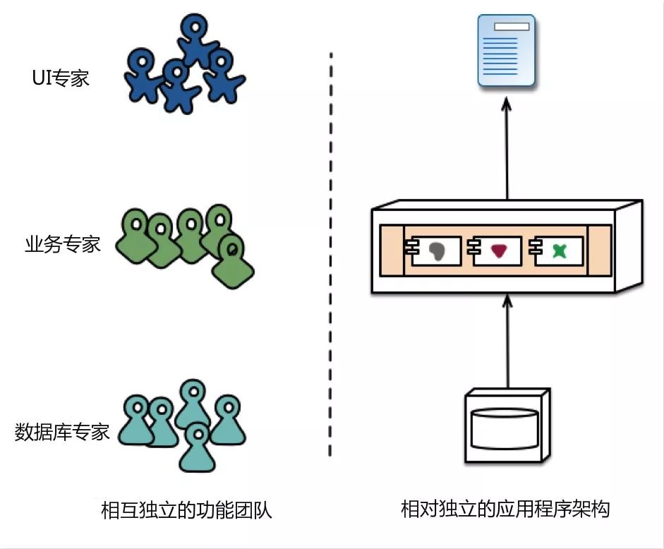 采用微服务架构风格的团队将围绕业务组织团队,而不是围绕技术组织团队,这一点和DevOps有异曲同工之妙。实施微服务前的组织结构如图1-6所示,对于集中式架构而言,拆分大型应用通常需要在技术层面上设立UI团队、后端开发团队、数据库团队。在这种团队划分方式下,即使进行简单更改也会导致协作团队垮掉。