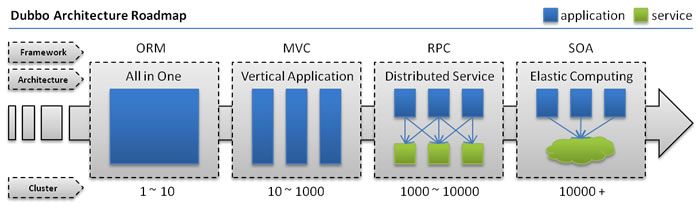 2011年前后,阿里巴巴开源的Dubbo框架成为对后世影响深远的一款分布式服务框架。Dubbo官方文档公布了一张有关SOA系统演化过程的图片(见图1-3),彻底奏响了分布式和SOA时代的最强音。服务发现、负载均衡、失效转移、动态扩容、数据分片、调用链路监控等分布式系统的核心功能也一个个趋于成熟。