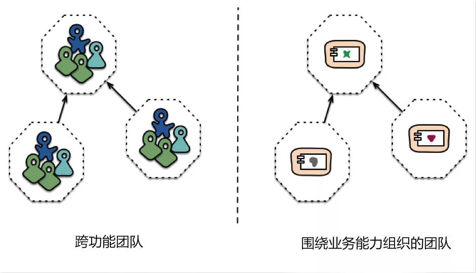 微服务架构风格则采用围绕业务线进行划分的方式,以保证一个团队中能拥有UI工程师、开发工程师、DBA和项目经理。实施微服务后的组织结构如图1-7所示。