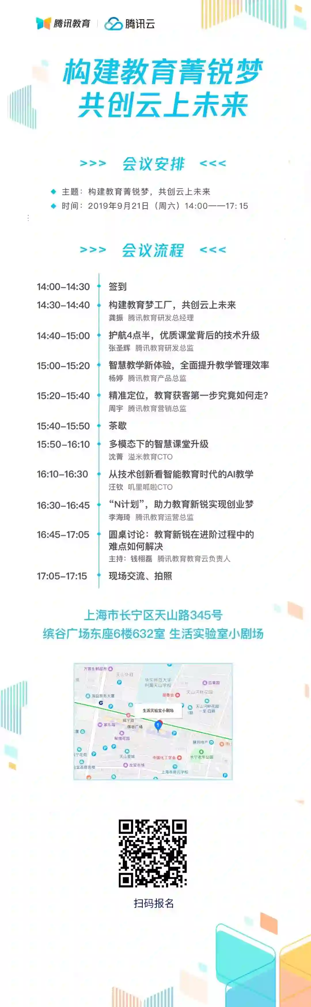 此外,来自溢米教育 CTO 沈菁、叽里呱啦 CTO 汪钦将基于实践案例,为大家剖析智慧课堂解决方案背后的思考,现场更有腾讯教育“N 计划”解析,并进行以《教育新锐在进阶过程中的难点如何解决?》为主题的大咖现场圆桌对话,基于行业发展热点与痛点问题,为你答疑解惑。