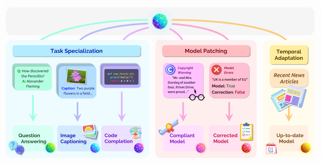 局部模型编辑。 在某些情况下,对基础模型进行局部的调整很有价值,局部调整是指模型的预测分布应该仅针对单个输入或单个输入周围的局部邻域进行调整,而不改变模型对不相关的输入的反应。例如,当基础模型对特定输入短语和目标语言产生特别有问题的误译时,希望在不影响模型对不相关短语的反应的情况下纠正这种误译。过去的工作研究了通过新的预训练目标将近似局部更新应用于大型神经网络的问题,这些目标可以轻松地使用标准梯度下降 [Sinitsin et al. 2020] 、可以预测底层模型的参数编辑方式的高阶网络 [Cao et al. 2021] 以及约束微调程序[Zhu et al. 2020] 等方式对模型进行编辑。然而,现有方法在执行模型编辑而不损害模型的全局性能可靠性方面存在差异。此外,由于所需要计算的高阶梯度 [Sinitsin et al. 2020; Cao et al. 2021] 的规模和训练目标的计算成本较大,将这些方法扩展到大规模基础模型存在一定的困难。