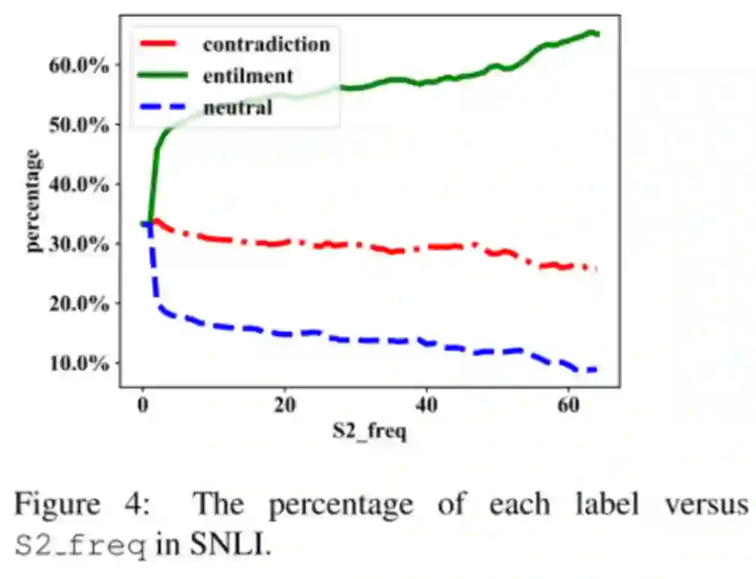 在 SNLI 的准备过程中,标注工人们需要根据给定的“句子 1” (premise scene descriptions) 为三种标签分别写一个“句子 2”。而在这个过程中发现,工人们会根据标签重复使用一些句子来做"句子 2",我们推测正是这种“复用”的操作导致了 SNLI 有偏。如下图,我们可以发现在 SNLI 中,随着 S2_freq 的增大,标签变得更倾向于是 Entailment。