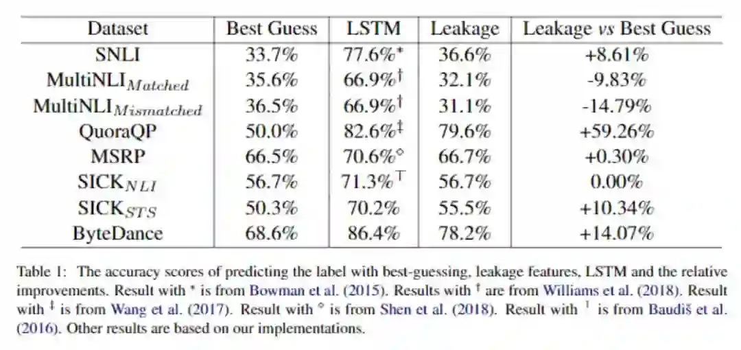 从表 1 可以看出,六个数据集中有四个都不同程度的受到 bias的影响。在 QuoraQP 上,只使用三个 Leakage Feature 甚至可以达到和 LSTM 差不多的结果。