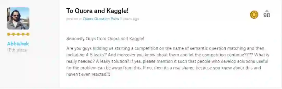 虽然 Leakage Feature 的预测能力很强,但是这些特征中的模式只是数据集构造过程中人工引入,在真实世界中不可推广。所以在比赛的讨论区中,Kaggle Grandmaster,boost.ai 的首席数据科学家 Abhishek 就曾质问比赛的严肃性。