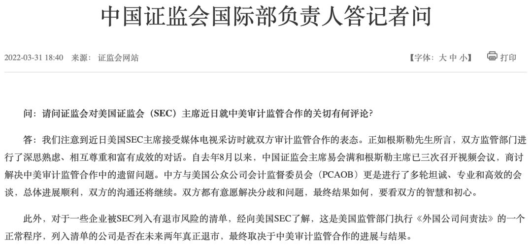 这意味着对审计机构的现场检查只能由中国证监会的人员进行,或美方只能通过中国证监会获取信息,现在规定的实施或许也会有所松动。