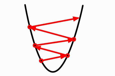 上述梯度下降算法中的 (取正数)叫做学习率或步长。需要注意的是,学习率过大可能会造成 迈过(overshoot)最优解,甚至不断发散而无法收敛,如下图所示。