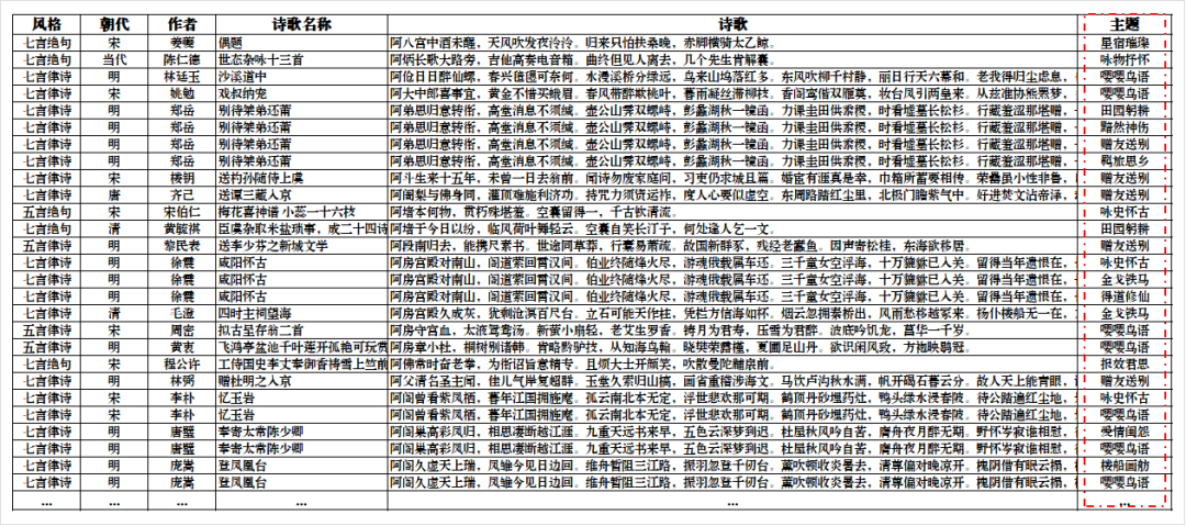 在这一环节,笔者根据对诗歌背景知识的了解,筛选出部分热门诗歌题材,并形成题材对应的关键词规则体系,后续可用于对这54万余首诗歌进行基于关键词的诗歌题材分类。