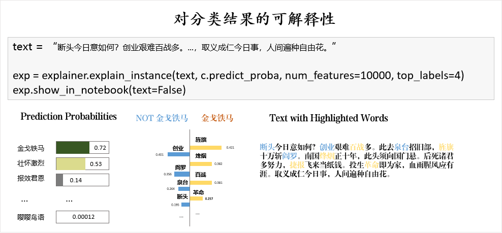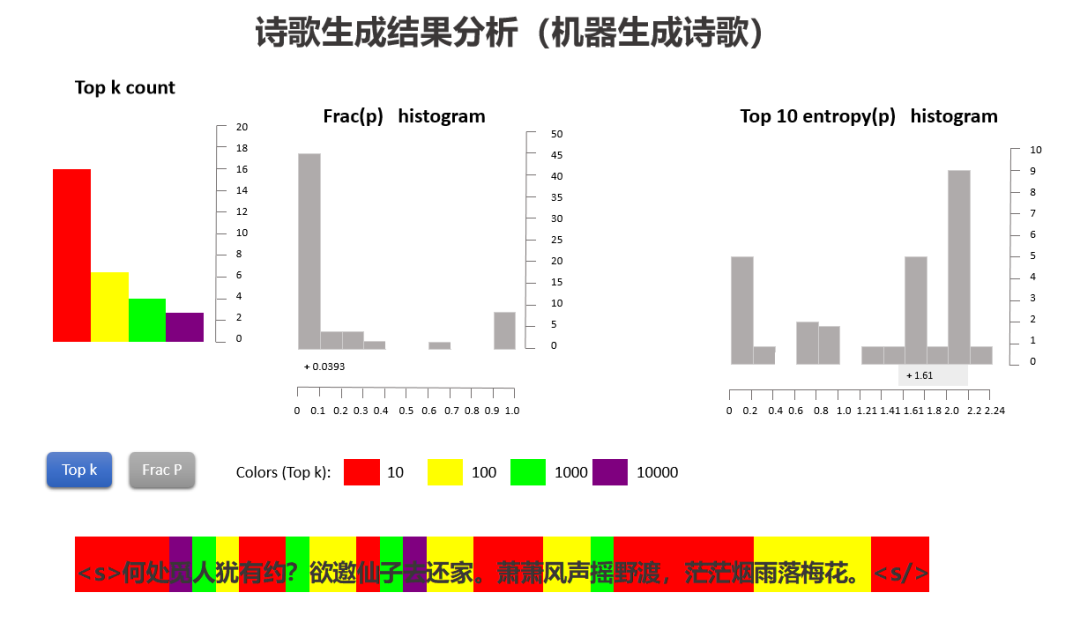 从结果中,我们可以看到机器作诗时,红色和黄色的字概率分布区间占比较大,逐字生成时一般是从头部的字概率分布中来取,从而导致会诗句生成较为常见的表达;人创作诗歌时,各颜色代表的字概率分布区间占比较为接近,至少是差异不大,最终导致诗歌的表达千变万化,不落俗套。