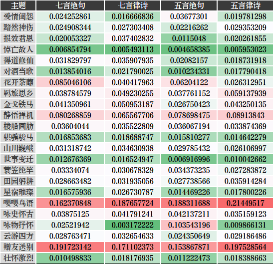 在这一环节中,笔者的在于根据一些诗歌领域知识,找到上述运行结果中热门题材及其下辖的题材专属性词汇。其中,“题材专属性词汇”的内涵主要有以下两点:
