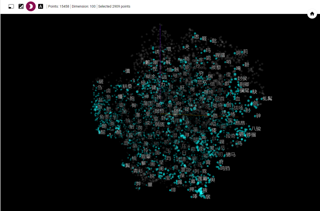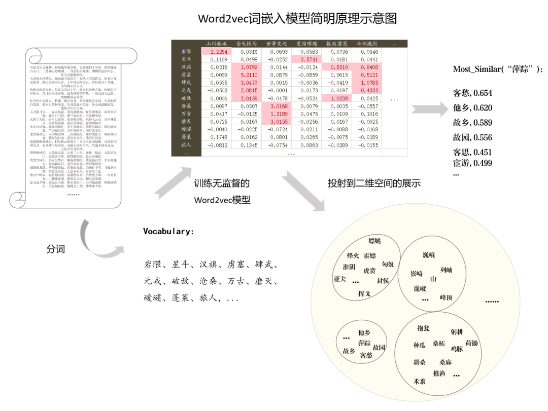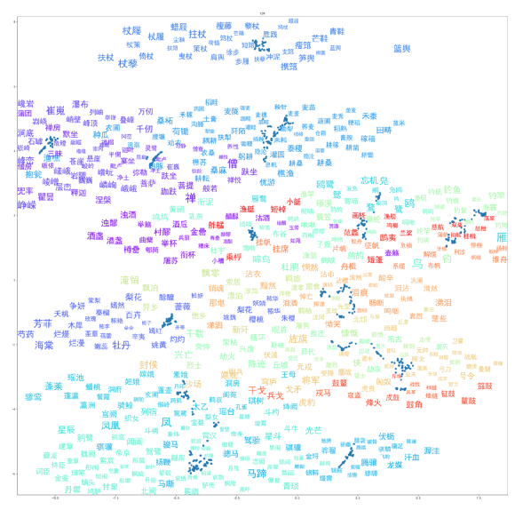 词嵌入模型可以从海量的诗歌文本中自动学习到字词之间的关联关系,据此可实现字词关联度分析、字词相似度分析、聚类分析等任务。
