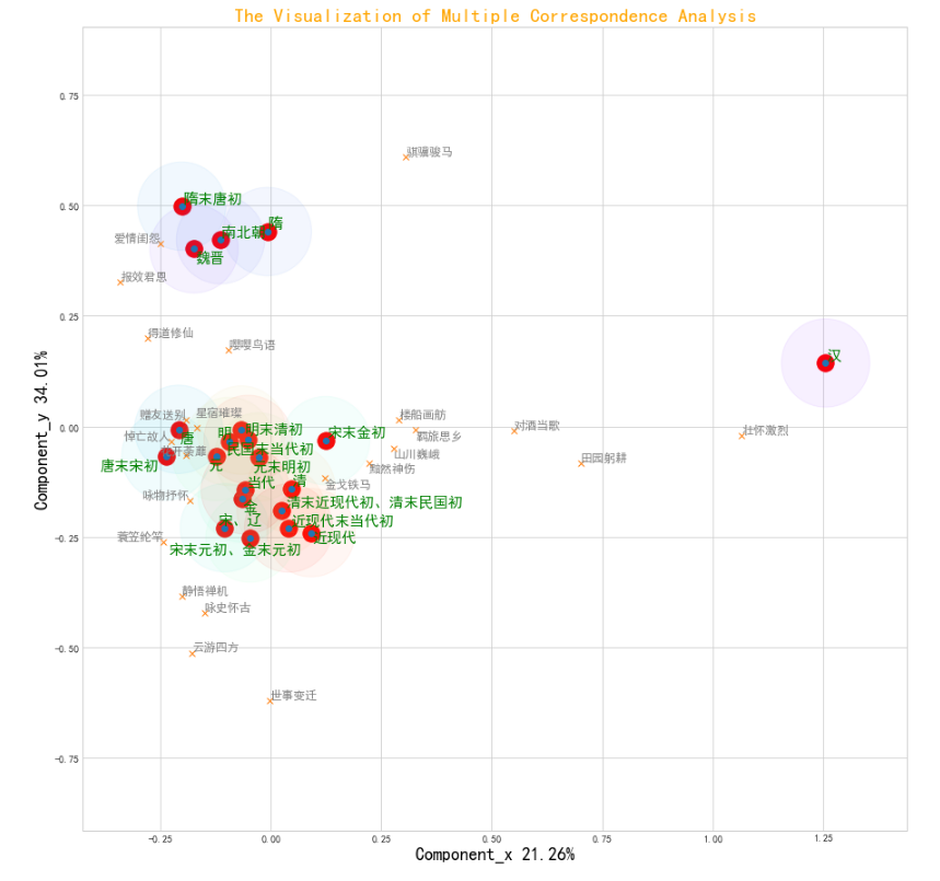 其中,不同颜色表征不同的题材,字体大小代表其出现频次,词汇之间的距离远近表征其相关程度大小。