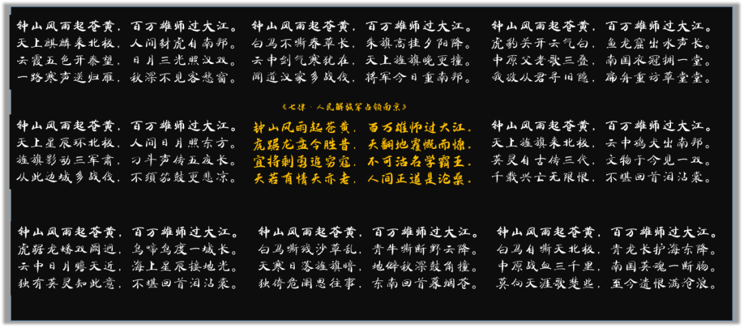 上面两张图中占据中间C位的是原诗歌,其余的诗歌由毛主席和陈老总诗歌的首联“引导”而成,基本含有“金戈铁马”相关的意象,题材贴合度较高,大都跟征战、戌边、杀敌保国有关,比如: