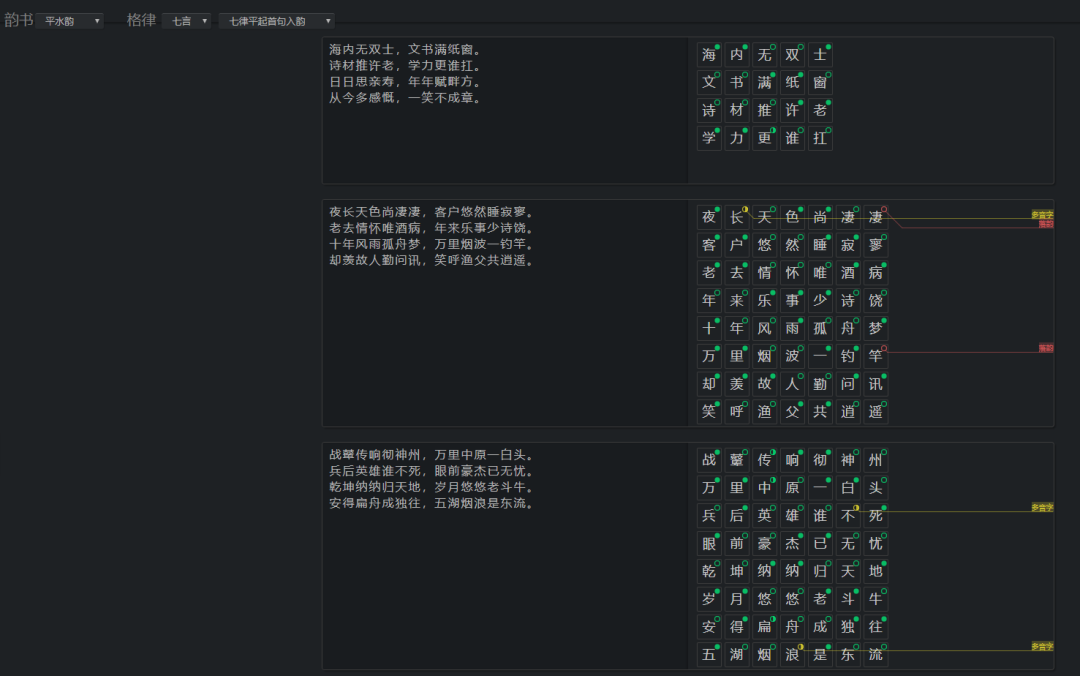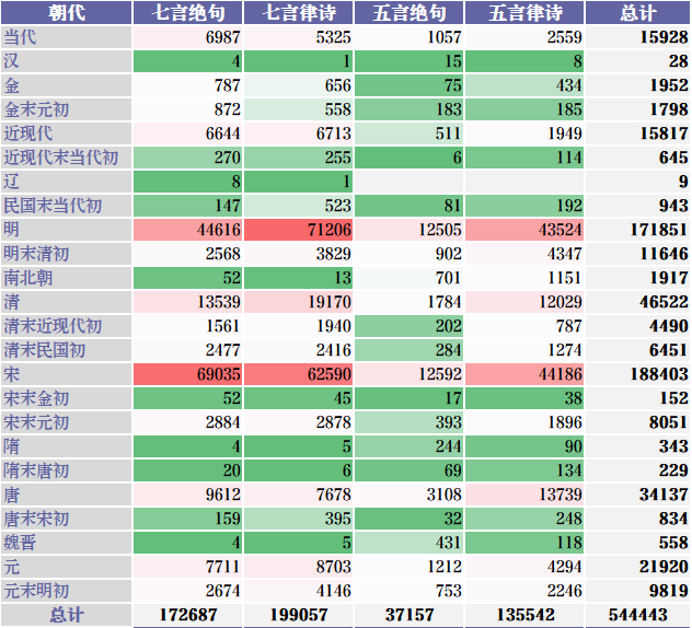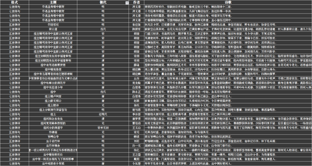 为了方便后续的分析,笔者仅取其中的律诗和绝句,且仅取其中的五言和七言,排律(如《春江花月夜》、《长恨歌》等)、杂言(如李白的将进酒)等就不在本文的分析范围之内。