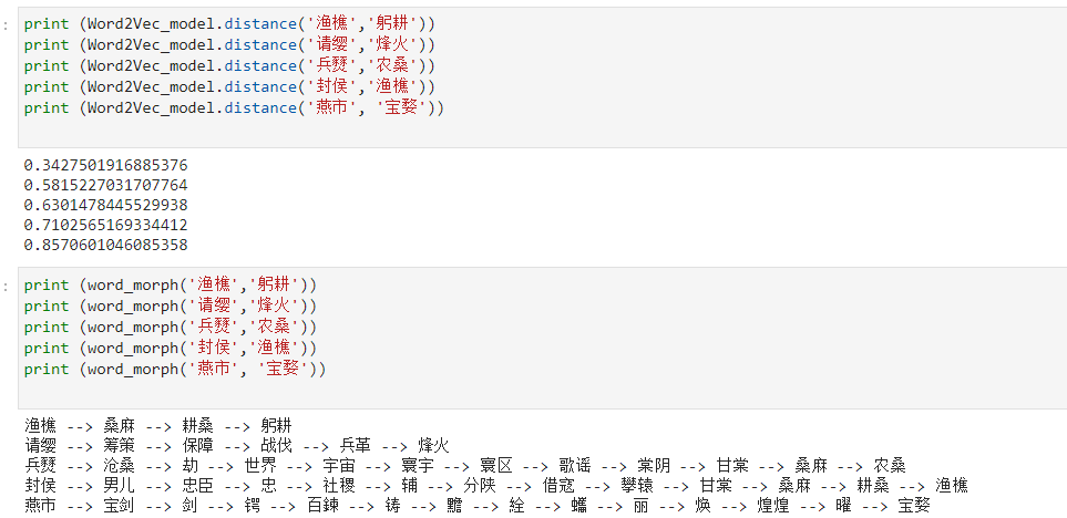 在上图的5个词汇对中,“渔樵”和“躬耕”之间的语义距离最短,也就是语义相关度最高,它们之间的语义演变路径也就越短,中间只隔了2个词汇;“燕市”和“宝婺”的语义距离最大,语义相关度最小,二者的语义演变路径隔了12个词汇。