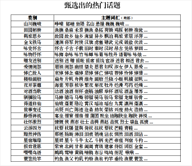 经过笔者的仔细甄别,共甄别出23个热门诗歌题材,分别是