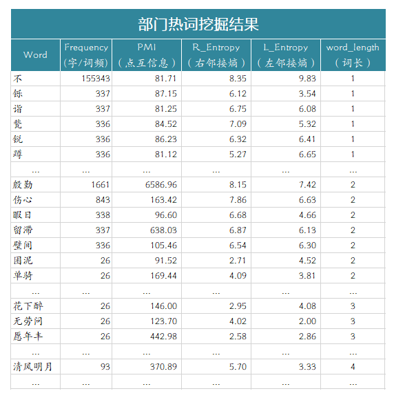 笔者观察其中部分结果,发现一字词、二字词才能算得上一般意义上的词汇,如“不”、“烁”、“岁寒”、“留滞”等 ;三字词和四字词一般是多类词性词汇的组合,严格上讲,应该算作短语或者固定表达,如“随流水”、”云深处”、“人间万事”、“江湖万里”等。但本文为了表述方便,笔者将它们统一称之为词。