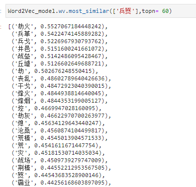 结果大都是跟“战争”&“创伤”相关的词汇,语义关联关系捕获能力较强,后续的热门诗歌体裁挖掘任务也会用到词嵌入模型的这个特性。