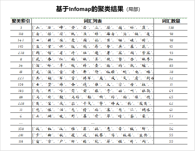 字词是承载诗歌题材的最小语义单元,如“五云山上五云飞,远接群峰近拂堤。若问杭州何处好,此中听得野莺啼”,看到其中的“五云山”和“群峰”,则可以给该诗打上一个“山川巍峨”的题材标签。由此,笔者接下来会基于社区发现算法,结合“词汇簇群--->词汇簇群语义特征--->题材标签”的思路来发现热门诗歌题材。