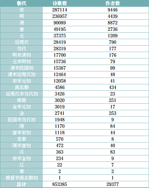 从上表可以看到,该诗歌语料库中共计近85万余首诗歌,诗歌作者数量达29377位之多;其中,字段包括“题目”、“朝代”、“作者”和“内容(诗歌)”。