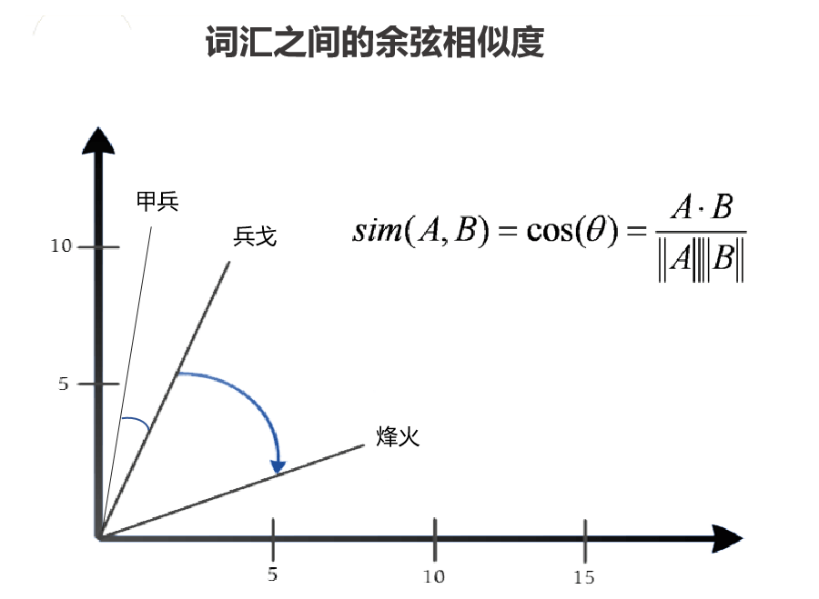 如下图所示,展示了“甲兵”、“兵戈”和“烽火”之间的余弦相似度的可视化示意图