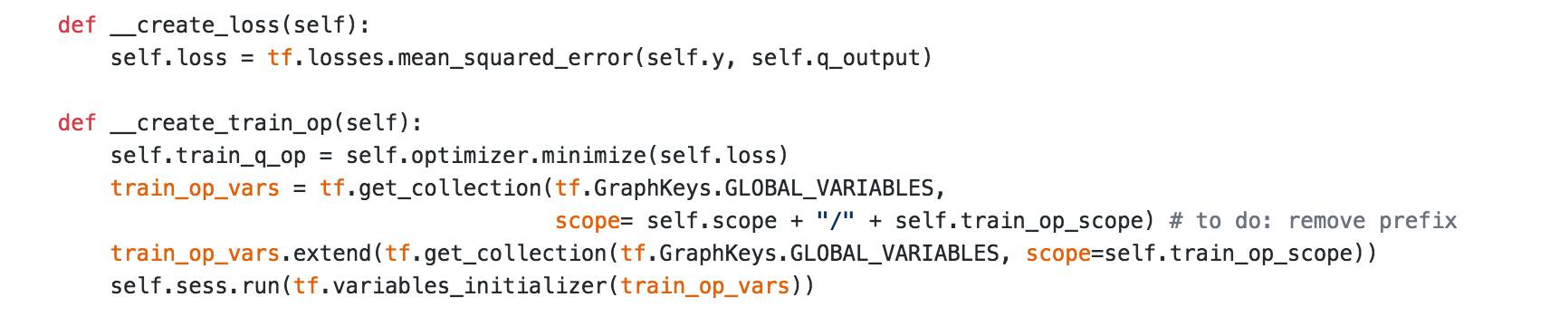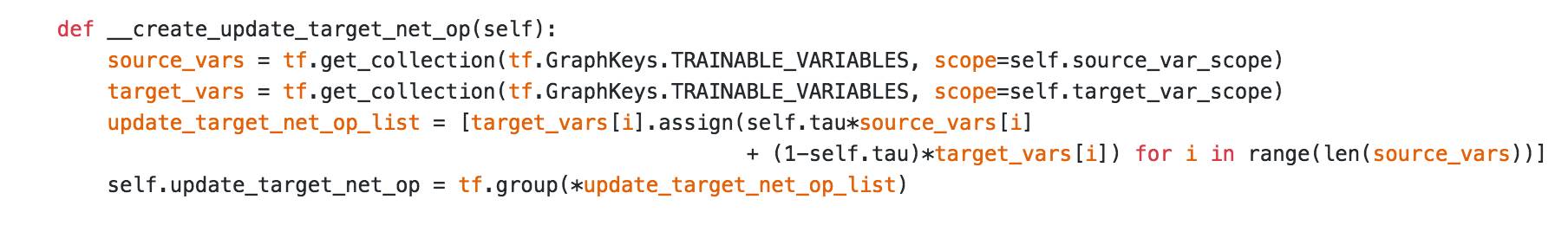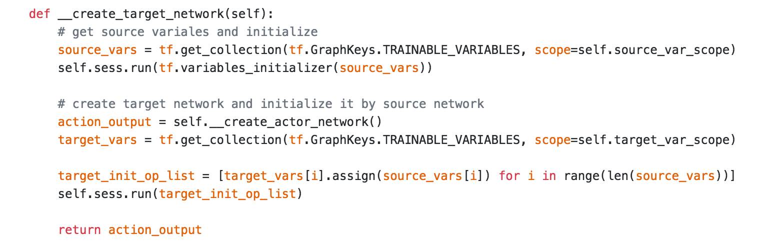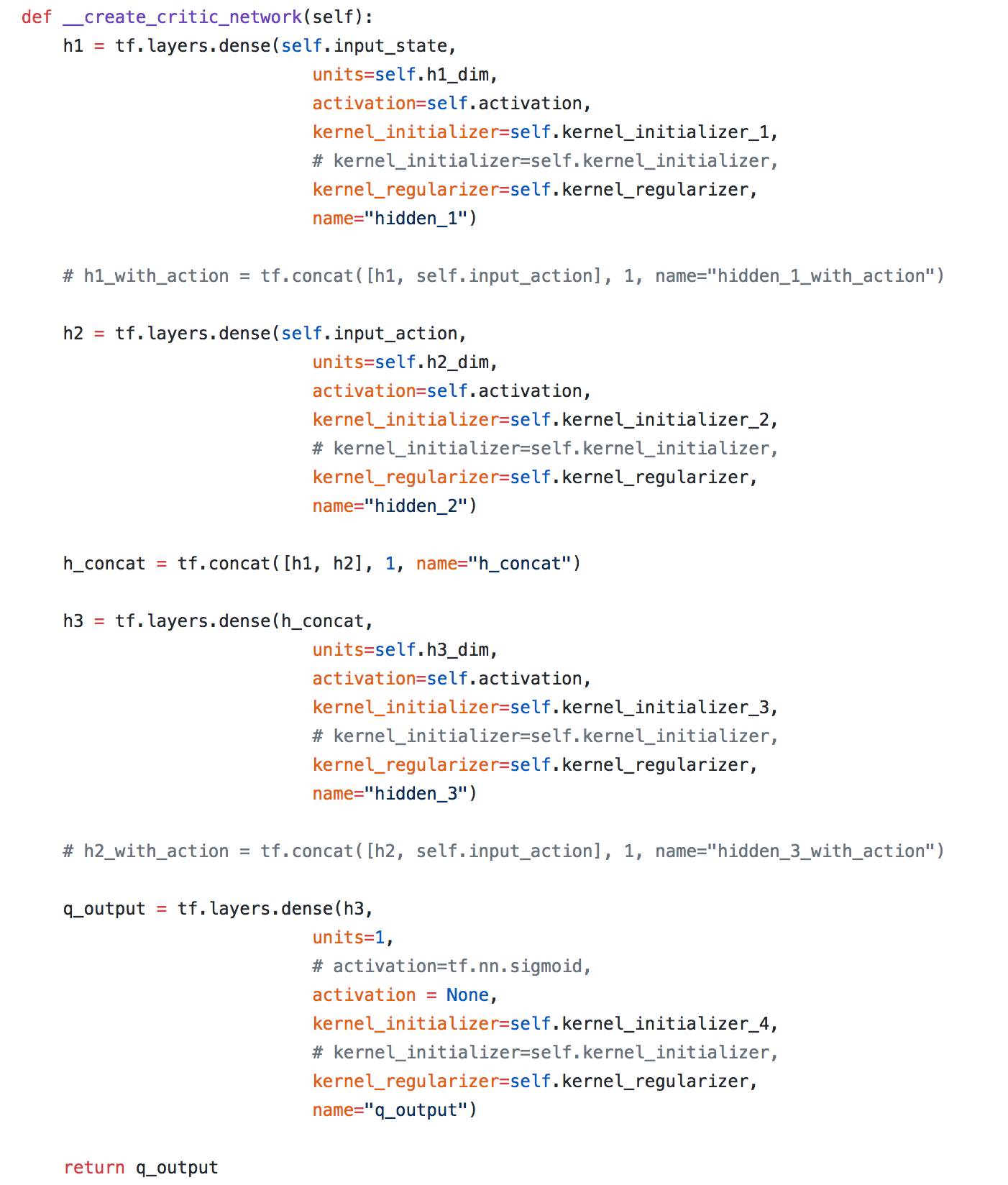 上面是target critic network的实现,target critic network网络结构和 critic network 一样,也参数初始化为一样的权重,思路是先把 critic network 的权重取出来初始化,再调用一遍 self.__create_critic_network() 创建 target network,最后把 critic network 初始化的权重赋值给 target critic network。