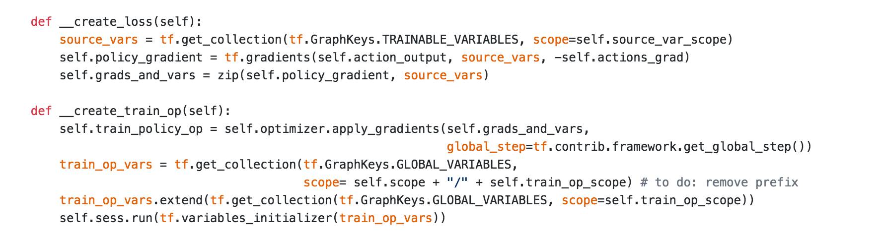 接下来,伪代码提到 replay buffer 和 random process,这部分代码比较简单也很短,主要参考了 openai 的 rllab 的实现,大家可以直接看看源码。
