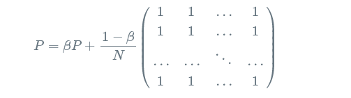 最后,为了使我们的矩阵不受周期和条件的限制,拉里和谢尔盖在1998年引入了一个著名的技巧。在斯坦福的CS246中有很好的解释,但是为了缩短它,它主要包括用以下公式更新我们的流动矩阵: