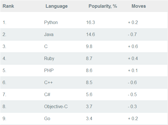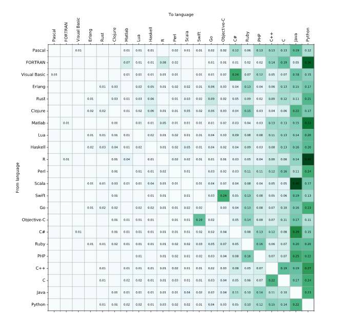在最流行的5种语言(Java、C、C++、PHP、Ruby)中编写代码的开发人员最有可能用approx切换到Python。平均22%的几率。