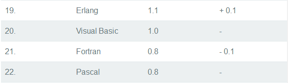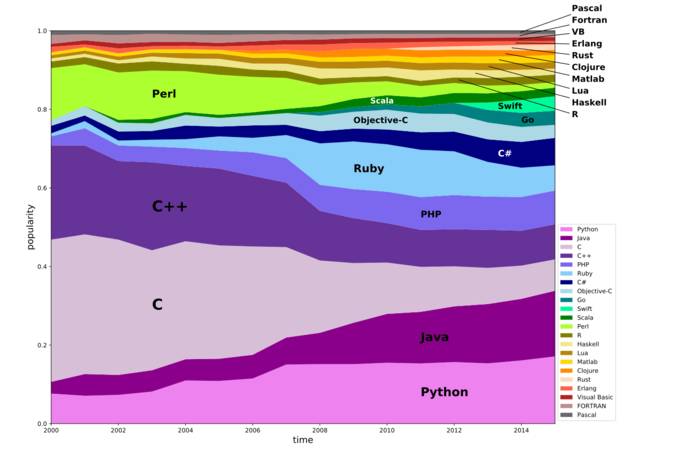 前两种语言,Python和Java具有相同的配置文件。他们已经取代C的位置已经15年了。事实上,前三层的聚合给出了一个直的。