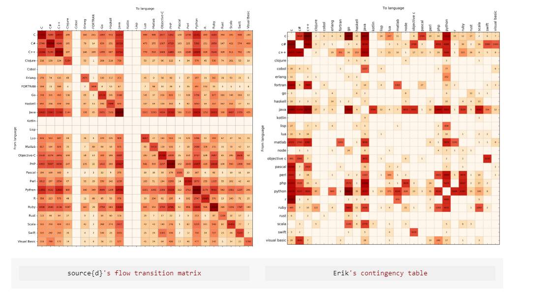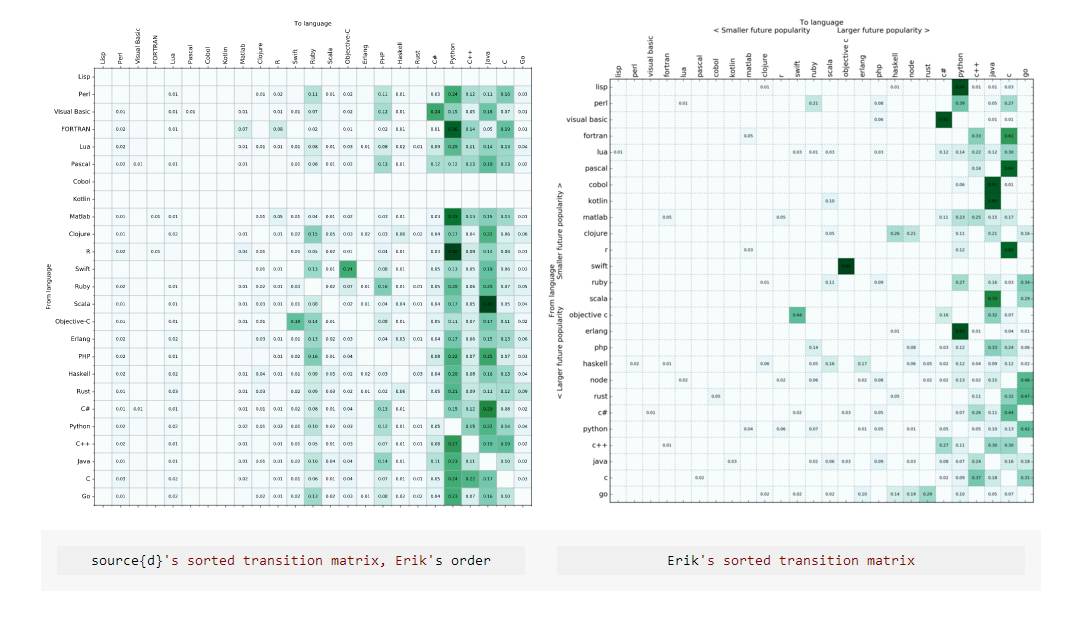 埃里克的转移矩阵是排序的,因此最流行的语言出现在底部。我们用同样的顺序来比较它们: