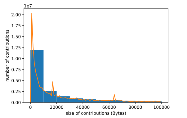 你肯定会同意,GitHub的“Hello world”库并不真正算作是切换到另一种语言。因此,我们决定对数据集中的贡献值进行量化,以减少干扰。出于这个原因,我们在下面的小节中展示了GitHub每个字节大小的贡献的分布。