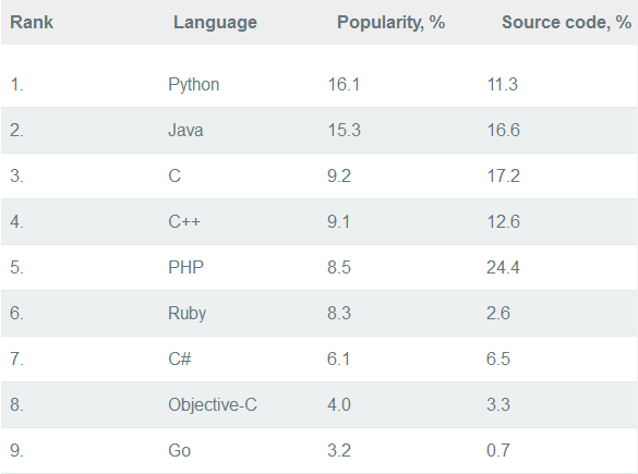 Python(16.1%)似乎是最吸引人的语言,紧随其后的是Java(15.3%)。这尤其有趣,因为GitHub上只有11.3%的源代码是用Python编写的。