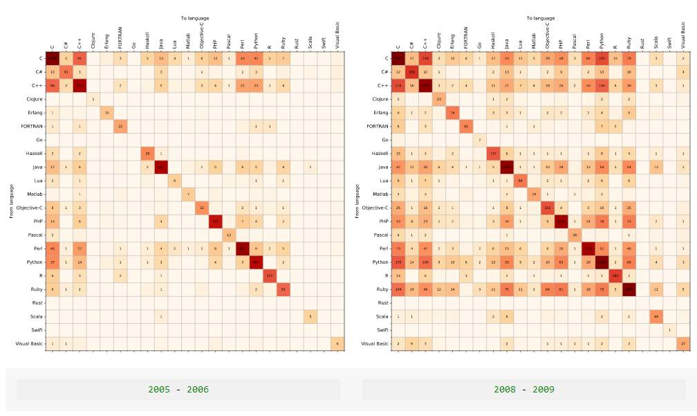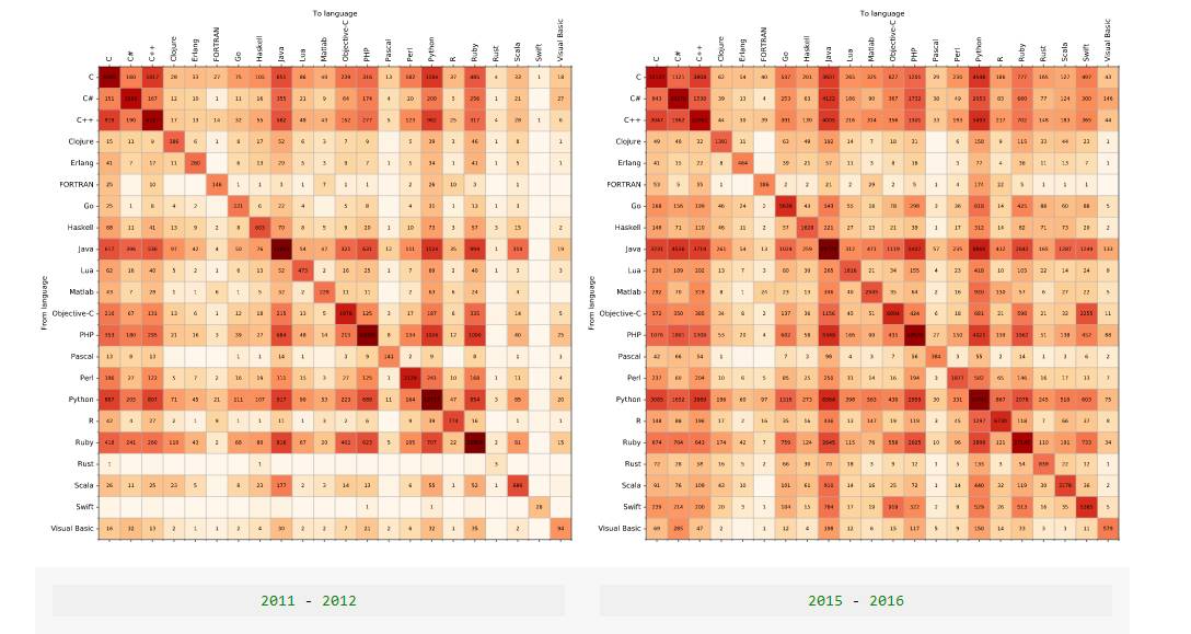 此外,根据埃里克的矩阵,人们从Ojective-C转换到Swift和返回的可能性更大——24%和19%。