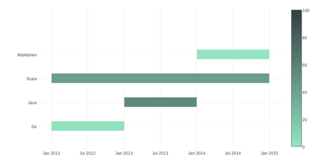 为了更好的理解接下来将会发生什么,我发现如果用甘特图的形式将开发语言的使用历史以可视化的形式进行展示,效果很不错。